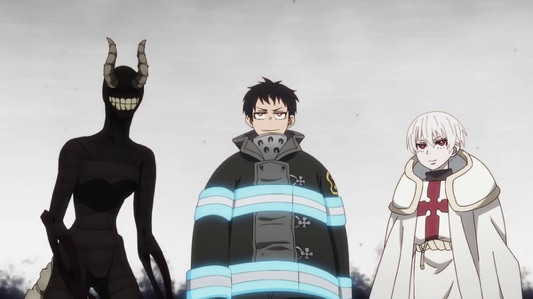 Shinra's rage and despair spark the transformation of the earth into a second sun. With humanity's wish fulfilled, Haumea prays for her own death. Shinra faces her with a demonic expression, intent on killing her. Then, a huge flash of light strikes from space! The battle between the saintess (Haumea) and the hero (Shinra) reaches its climax!
