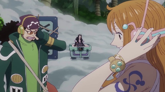 Just like when St. Saturn emerged on Egghead, black lightning strikes and pentagrams appear again. The Pacifistas are rendered immobile by an unknown shadow. Meanwhile, as the time for the Straw Hats to evacuate the island is drawing near, the fight between Zoro and Lucci intensifies.